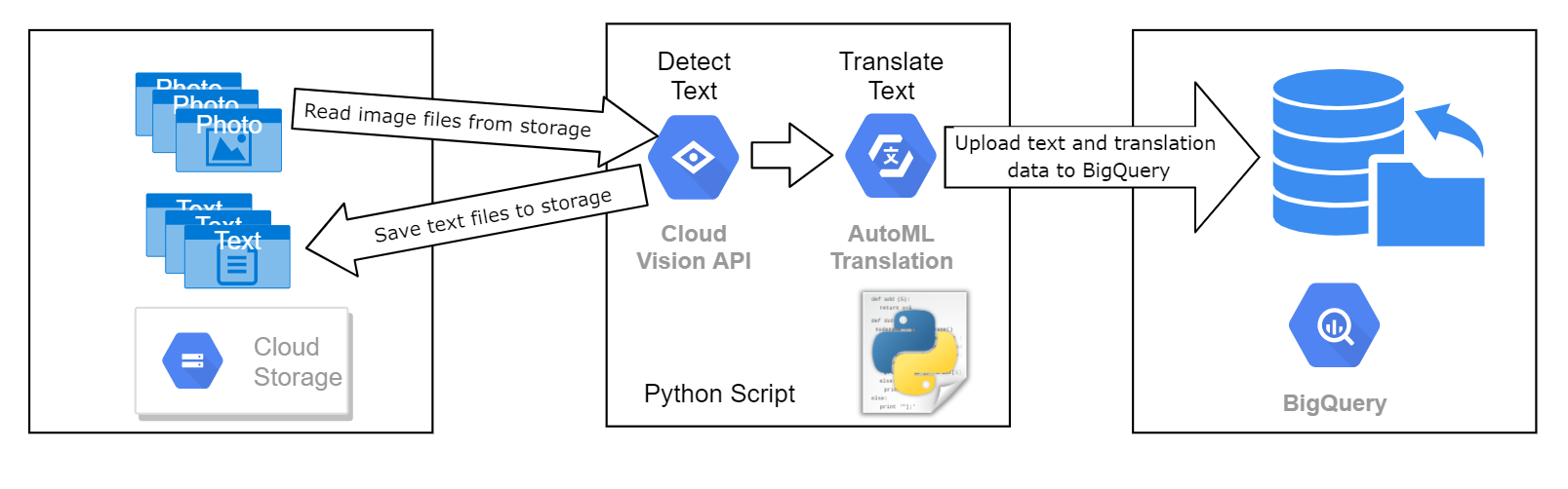 You must use a Python script to process each of the image files by sending them to the Google Vision API to identify the text in the image. The text from each image must be saved back to files on Cloud Storage, with a separate file for the text from each image. If the text locale is not English (locale='en'), you must then send the text to the Google Translate API to get an English translation for the original text. Once all of the images have been processed, the script must upload the results to a BigQuery table.
